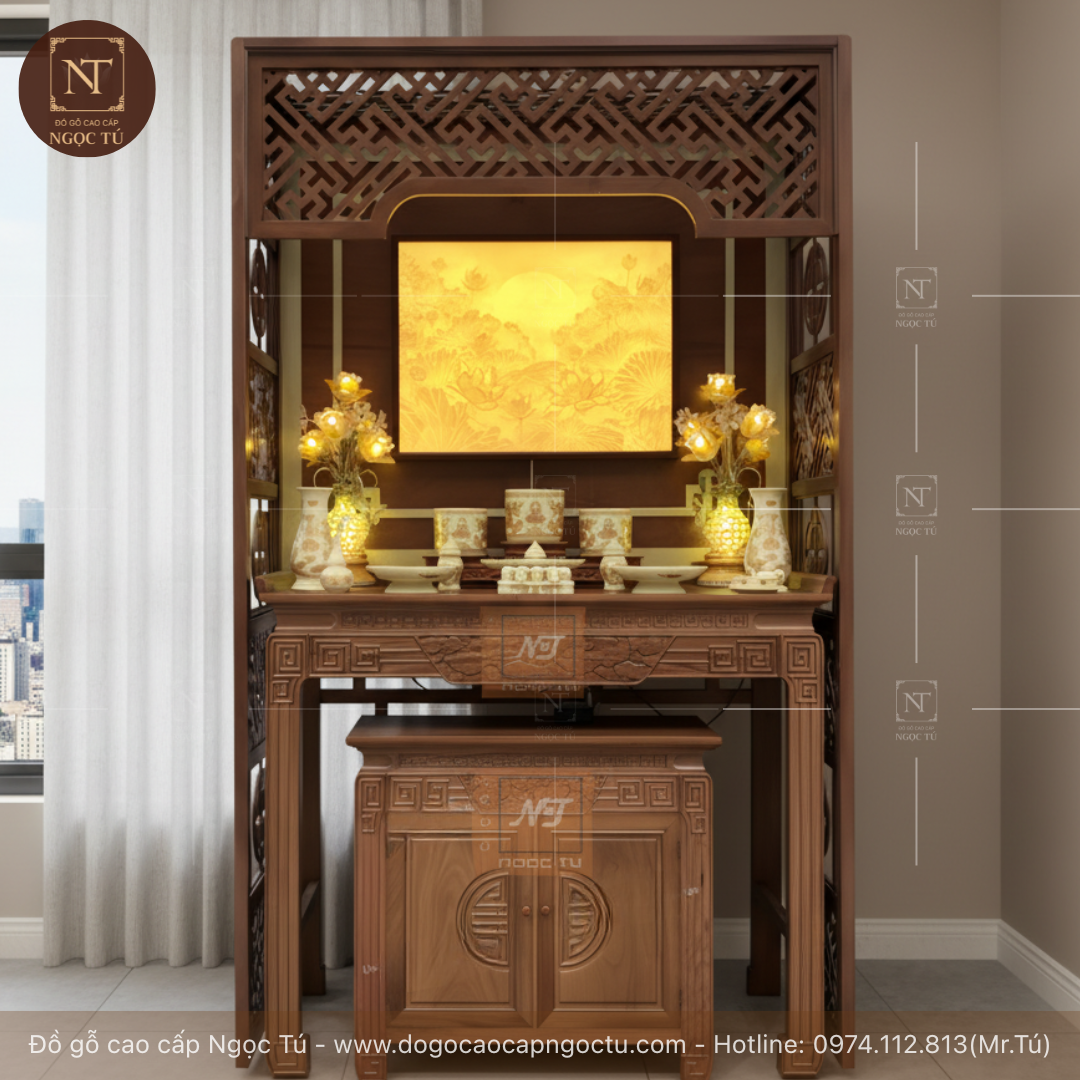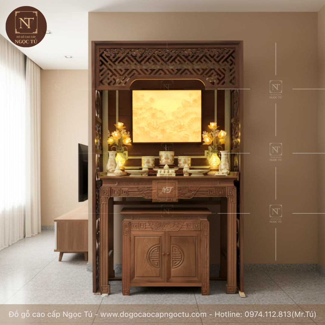 Bàn thờ là nơi kết nối giữa người sống và tổ tiên, thể hiện sự biết ơn và lòng thành kính. Gỗ Gõ Đỏ với tính dương mạnh mẽ, sinh khí vượng mang lại phong thủy tốt, thu hút tài lộc và bình an cho gia chủ. Kiểu dáng bàn đôi hiện đại – kết hợp hài hòa giữa truyền thống và tiện nghi – giúp gia đình tổ chức lễ cúng trang trọng, trọn vẹn ý nghĩa tâm linh.
